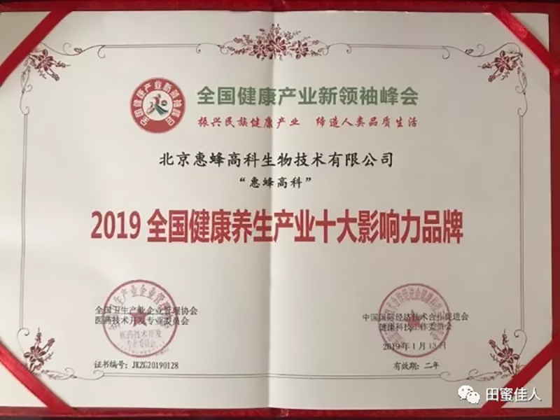 北京惠蜂高科生物技術(shù)有限公司榮獲“2019全國健康養(yǎng)生產(chǎn)業(yè)十大影響力品牌”