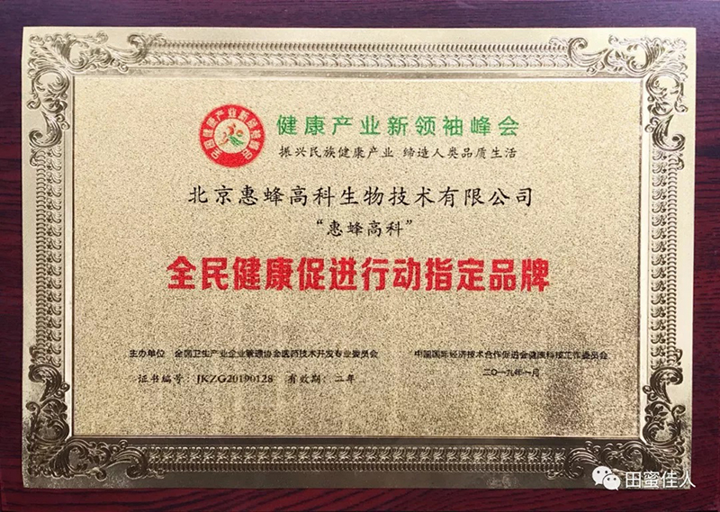 北京惠蜂高科生物技術(shù)有限公司榮獲“全民健康促進(jìn)行動指定品牌”