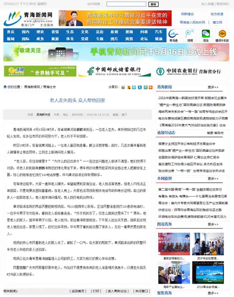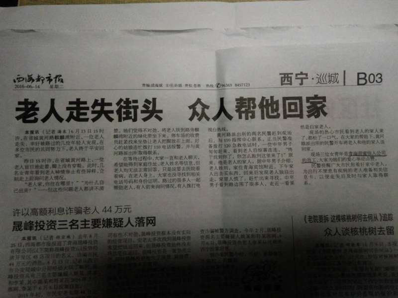 青海新聞網(wǎng)訊 6月13日15時許,在省城黃河路麒麟灣附近,一位老人走失,幸好被路過的幾位年輕人發(fā)現(xiàn),在多位市民的共同努力下,老人終于平安回家。